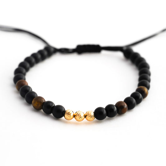 Pulsera tejida ónix y ojo de tigre con bolitas diamantadas 5mm en Oro18k