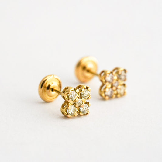 Aretes bebé trebol mini con diamantes 0.26 cts en Oro 18k