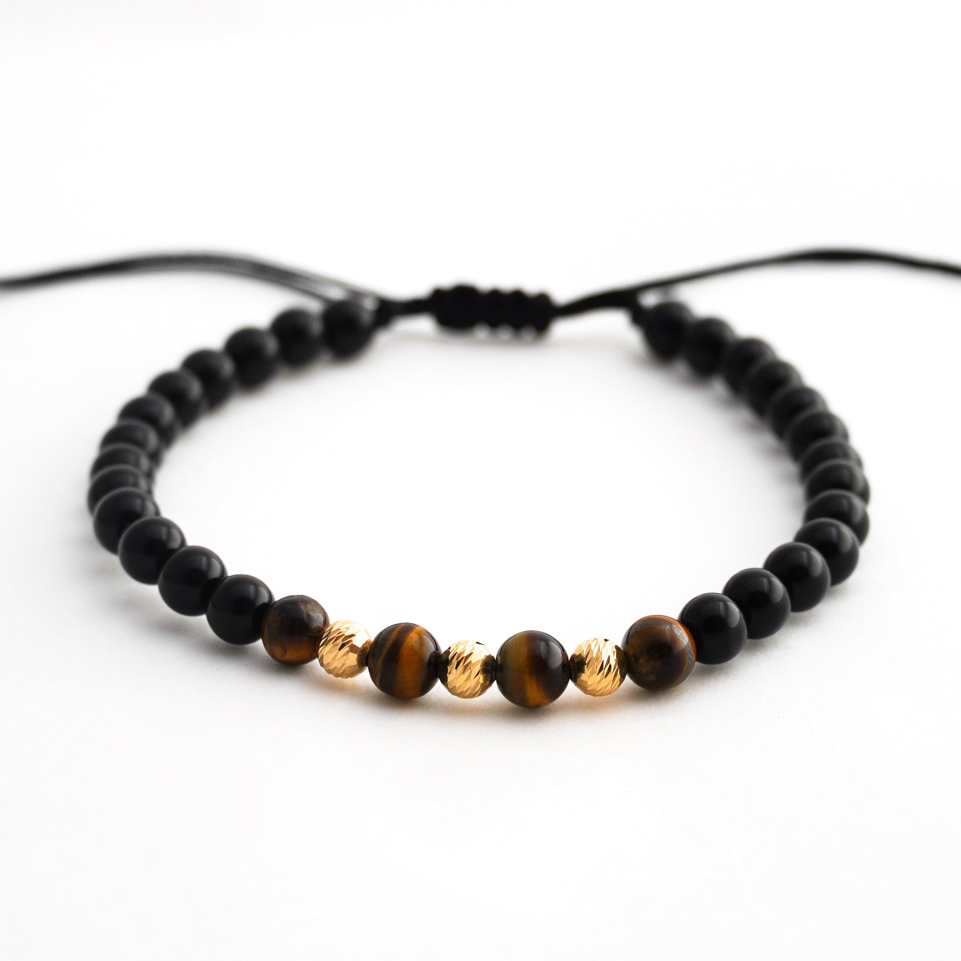 Pulsera tejida ónix y ojo de tigre con bolitas diamantadas 5mm en Oro18k